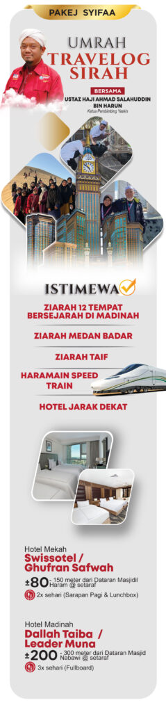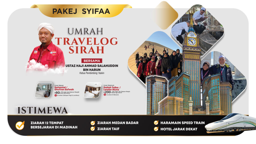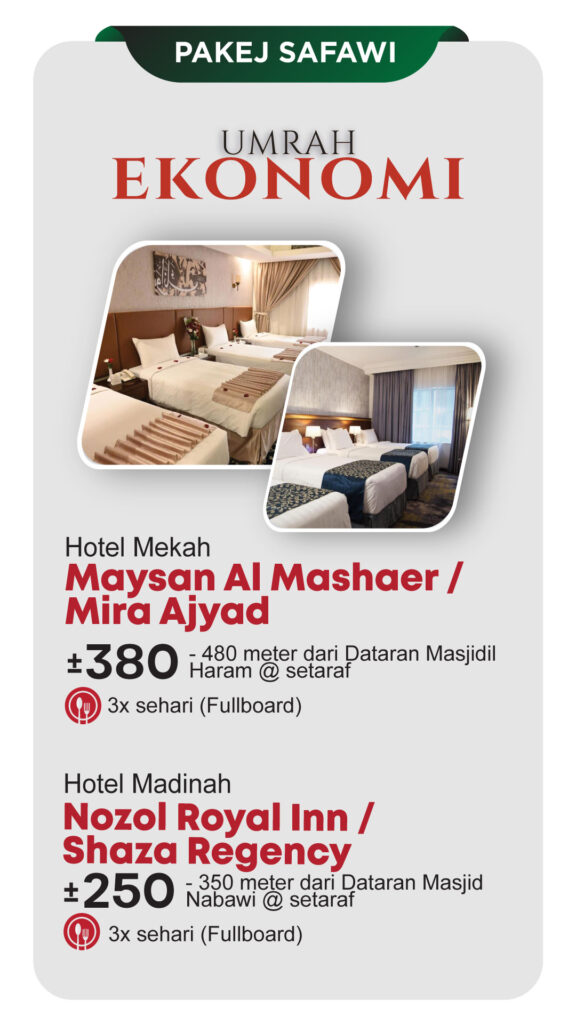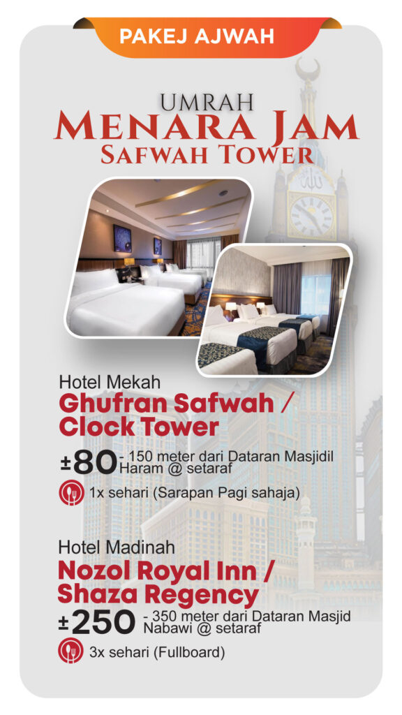 Nikmati perjalanan umrah selesa dengan penerbangan premium, hotel bertaraf 5 bintang, mutawwif berpengalaman, makanan halal, dan ziarah Mekah-Madinah. Tempat terhad! Tempah sekarang untuk pengalaman ibadah yang tenang dan sempurna. Hubungi kami segera!